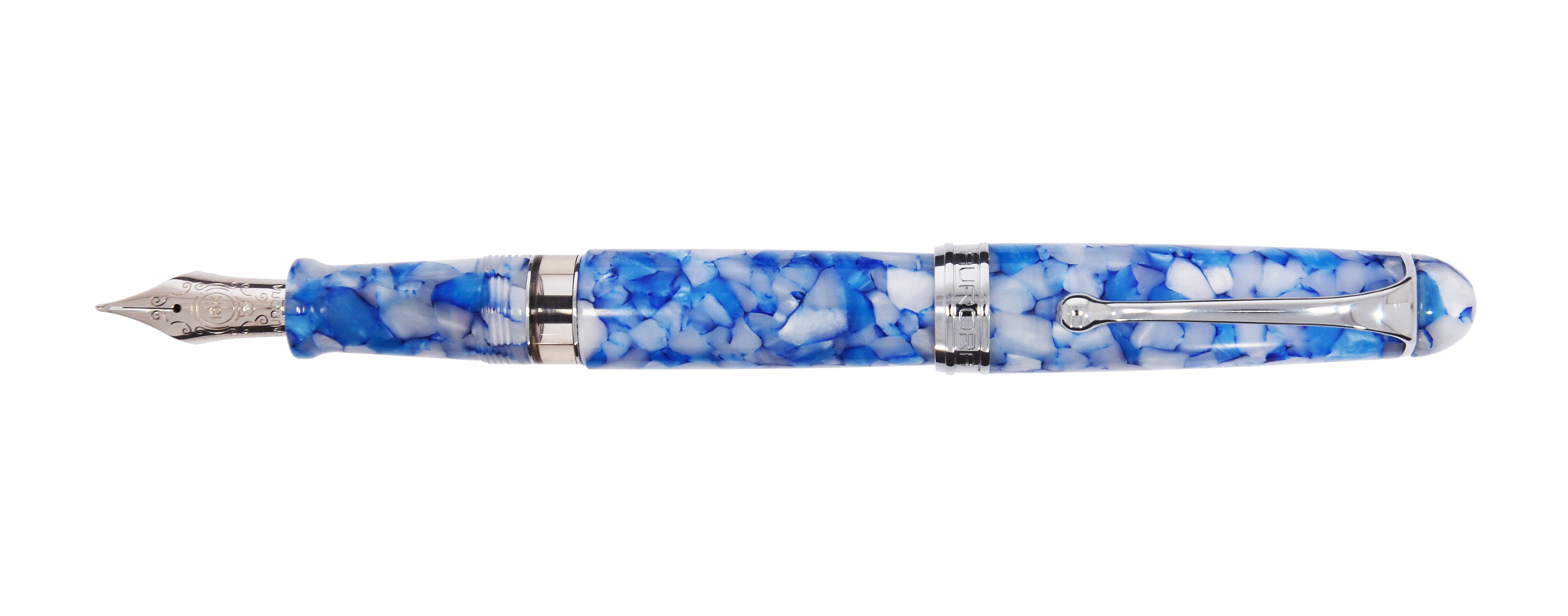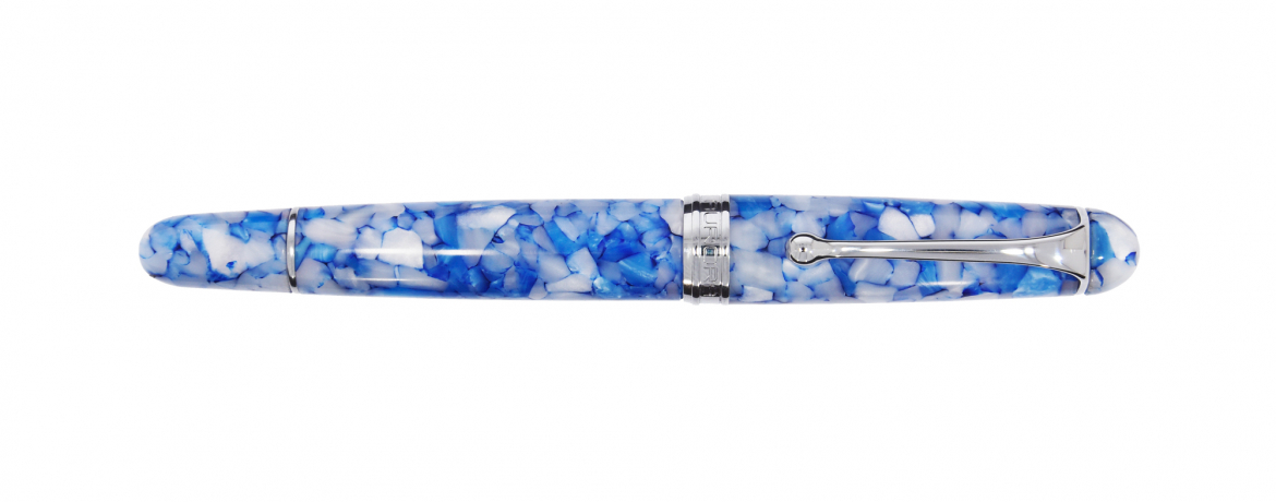 Stilografica con corpo in Auroloide screziata turchese e bianca. Pennino in oro massiccio rodiato 18kt.