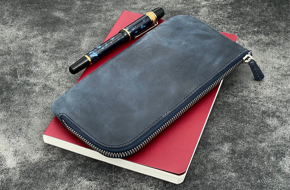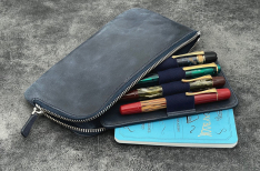 Galen Leather Slip N Zip 4 Slots Zippered Pen Pouch - Crazy Horse Navy Blue