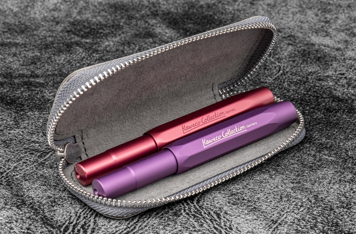 Il nostro astuccio doppio in pelle viola con cerniera è stato creato appositamente per gli amanti delle penne stilografiche. Realizzato a mano in vera pelle, questo astuccio con doppia cerniera permette di riporre in sicurezza la vostra penna stilografica o una penna tascabile Kaweco di dimensioni simili, proteggendola da graffi e perdite d'inchiostro in tasca o in borsa. Può contenere 2 penne Kaweco o penne stilografiche di dimensioni simili.