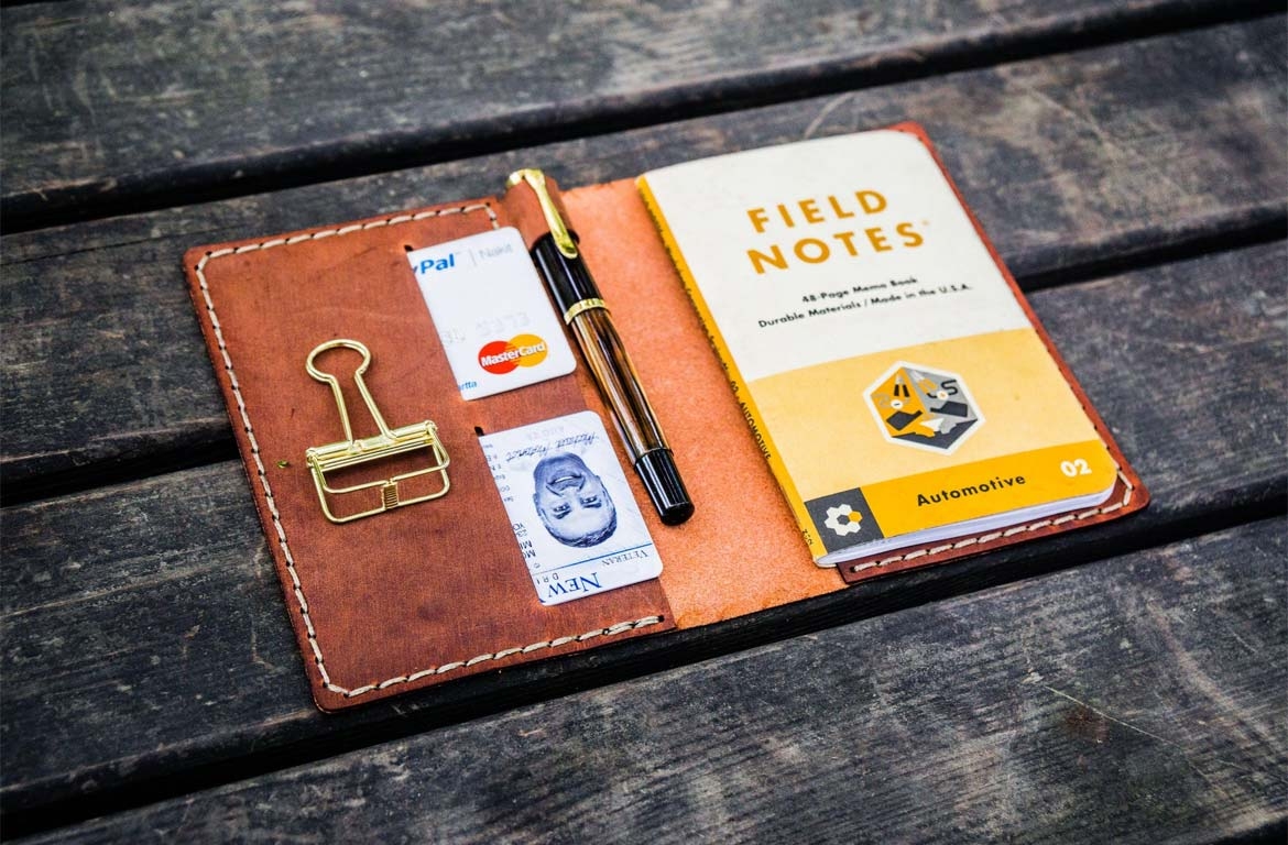 Copertina per taccuino Field Notes personalizzata in pelle n. 33, realizzata a mano.
