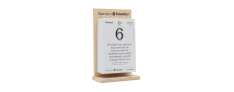 Il supporto è a forma di L, con una base profonda 6 cm e il pannello sul retro di 12 x 19 cm. L’inserto del calendario è sostenuto da un perno in legno di faggio di 6 mm.