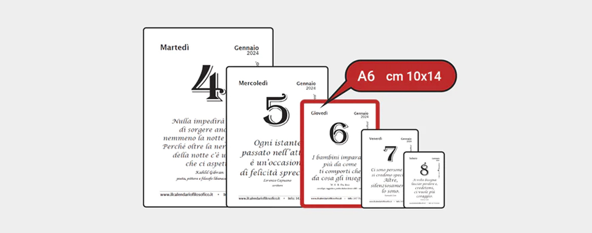 La versione che stai guardando ora è il formato A6 e misura 10 x 14 cm; è compatibile con il supporto del Calendario Filosofico 2023 formato A6.