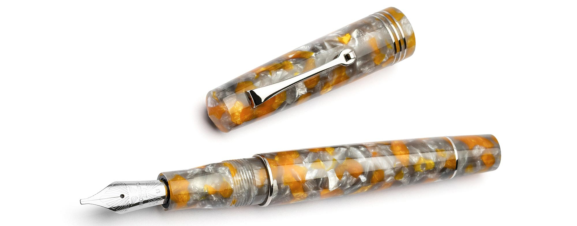 Disegnata nel 2017 seguendo le linee classiche delle stilografiche anni ’30; 3 anellini sul cappuccio, clip “ruzzolina” e le estremità coniche.