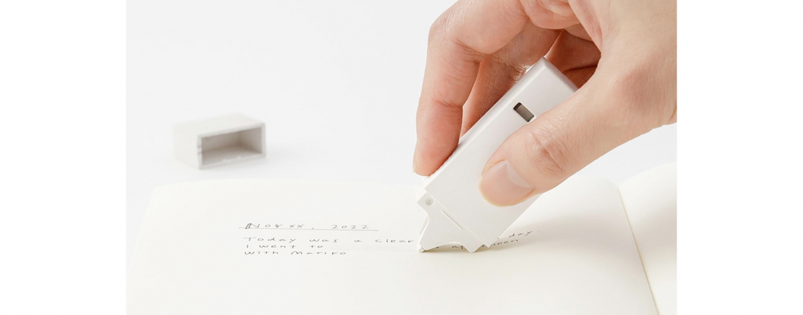 Questo nastro correttore sostenibile sostituisce tutte le parti in plastica, come la custodia, la struttura interna e la pellicola protettiva, con materiali ricavati da biomassa (51% carta + 49% PP) e carta, che possono essere smaltiti come rifiuti inceneribili. Il colore del nastro è bianco, per abbinarsi al bianco della carta, ed è largo 5 mm, per adattarsi a un tipico quaderno a righe orizzontali da 6 mm.