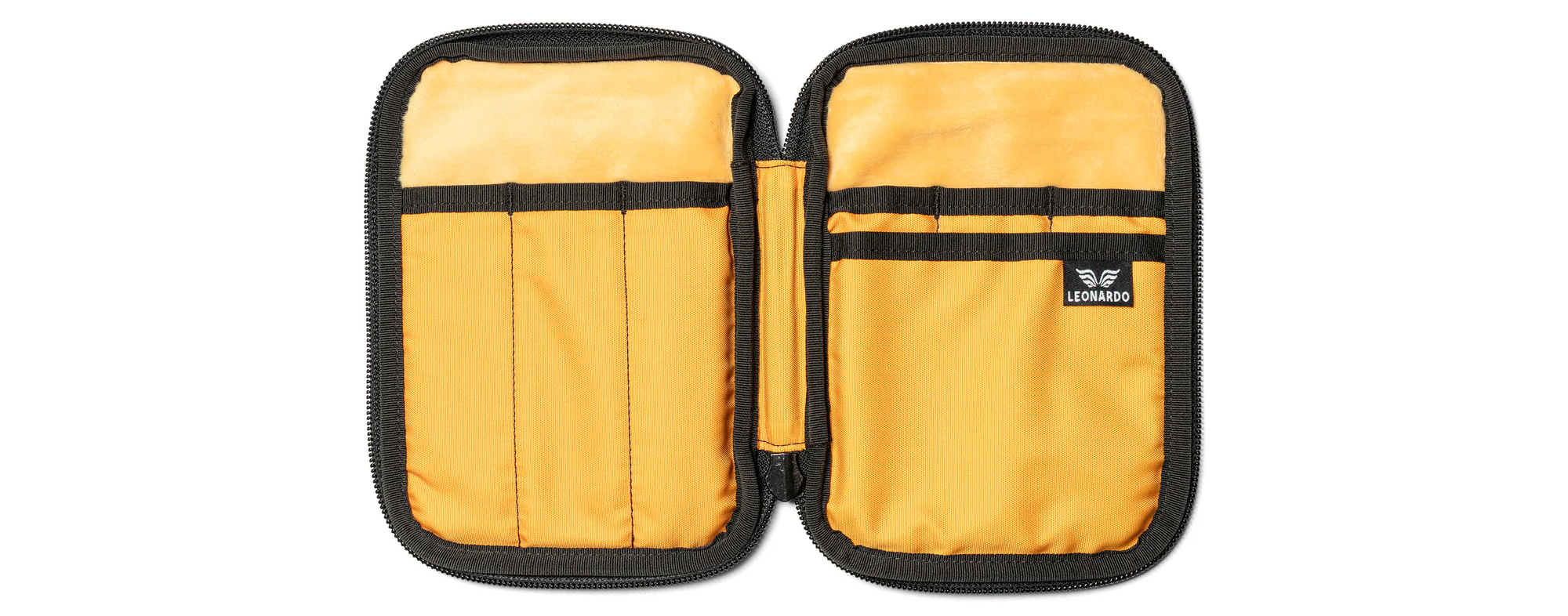 Nota che puoi acquistare anche il portapenne aggiuntivo Leonardo x Rickshaw 2-Pen Coozy , che si incastra perfettamente sul lato destro di questo astuccio portapenne Fillmore, consentendo di contenere fino a 8 penne.