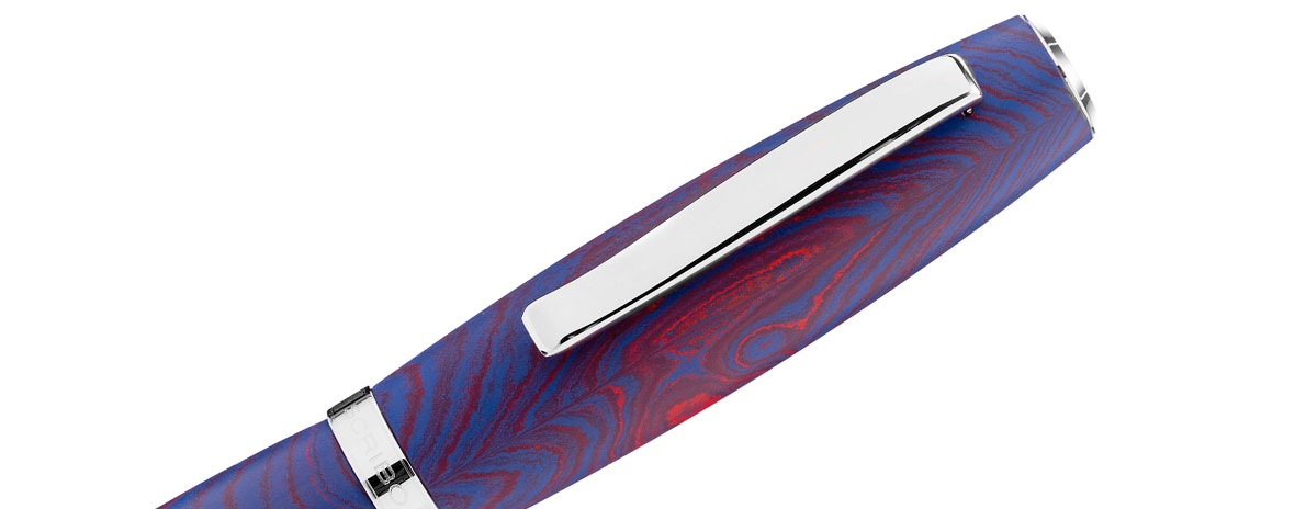 Realizzata in ebanite, materiale vivo e nobile, Liber Paradisus si distingue per una finitura opaca che restituisce al tatto una sensazione calda, profonda, quasi organica. La variante rossa, attraversata da venature gialle e impreziosita da finiture in oro, richiama il calore della terra e della passione civile. La versione blu, solcata da venature rosse e completata da finiture platino, evoca la profondità del pensiero, il dialogo tra rigore e immaginazione. Due interpretazioni cromatiche di uno stesso principio: la libertà come movimento, mai come stasi.